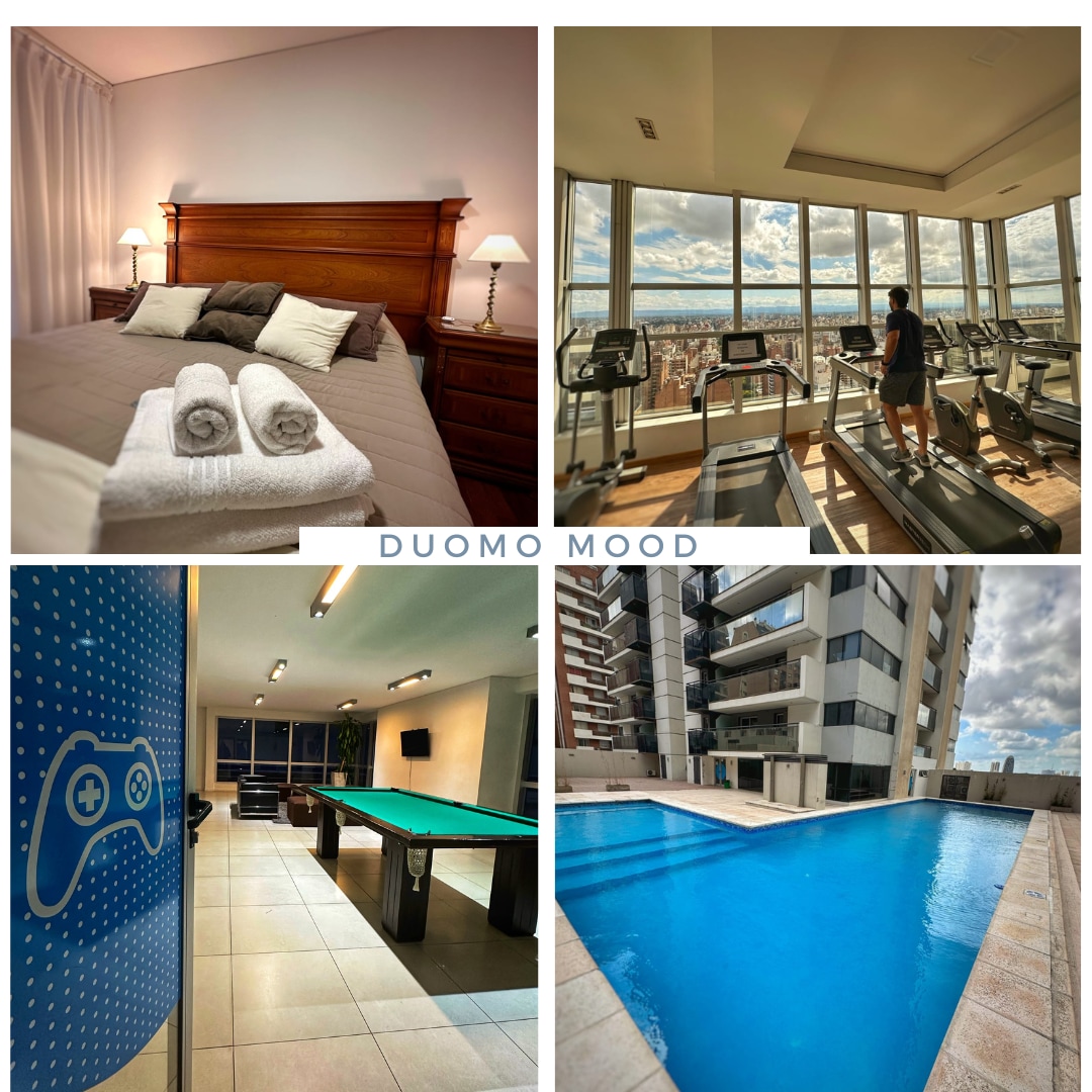 Disfruta de una confortable estadía en nuestro lindo apartamento localizado en Nueva Córdoba, es amplio, cómodo y con hermosa vista y completamente equipado. Cuenta con espacios comunes de piscina, gym, terraza con asadores y jardín. Se encuentra a pasos de la ciudad universitaria, solo 10 minutos caminando de Plaza España y 5 minutos en auto del Hospital Privado. Las parada de bus que se dirigen a las Sierras de Córdoba están a solo 50 metros de la entrada al edificio.