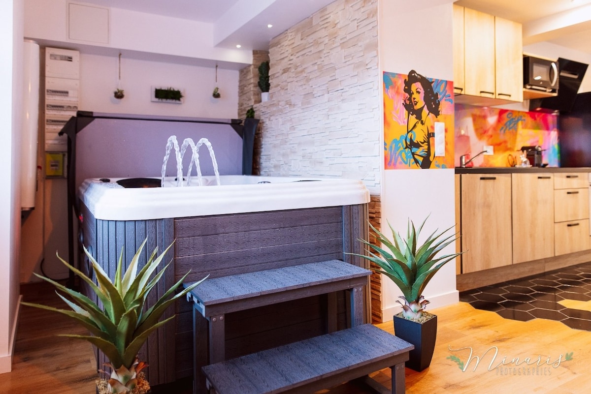 Logement Évasion de 40 M2 climatisé: pièce de vie avec cuisine,salon et jacuzzi. Une chambre romantique avec sont lit Queen size et d une douche a l'italienne avec sont mure végétale. Nous faisons les cartes cadeaux. Nous proposons 3 options en supplément: Mise en scène romantique avec bougies et pétales de roses à 20€. Mise en scène gourmande qui comprend la mise en scène romantique+1/2bouteille de champagne+petits fours sucré ou salé a définir ensemble à 50€. Mise en scène anniversaire a 20€ .