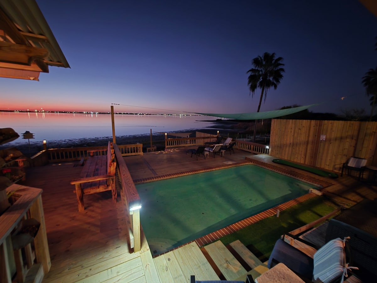 Kotedža un piestātne pie ūdens ir ideāli piemērota jūsu nākamajam atvaļinājumam, darījumu braucienam vai makšķerēšanas braucienam. Kotedža pie krasta atrodas Laguna Madre in Flour Bluff. Izbaudiet rīta kafiju vai tēju ar skaistāko sauli Laguna Madre no savas privātās piestātnes, dzīvojamās istabas vai guļamistabas! No logiem paveras skats uz ūdeni visā mājā. Atpūtieties un vērojiet putnus no terases vai atpūtieties un makšķerējiet no savas apgaismotās privātās piestātnes. Atpūtieties un izbaudiet uzturēšanos!