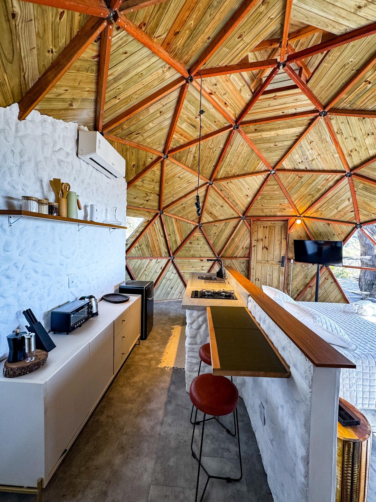 Izbaudiet unikālu uzturēšanos mūsu ģeodēziskajā kupolā Serra da Mantiqueira kalnā, ko ieskauj mežs. Atpūtieties burbuļvannā zem zvaigznēm, blakus mājīgam kamīnam. Viss tika veidots tā, lai jūs varētu maksimāli izmantot kupolu. Ārā izbaudiet apsildāmu baseinu ar hidromasāžu un grilu, ko papildina dabas skaņas. Naktī atpūtieties mūsu gultā ar termosegām. Laipni lūdzam