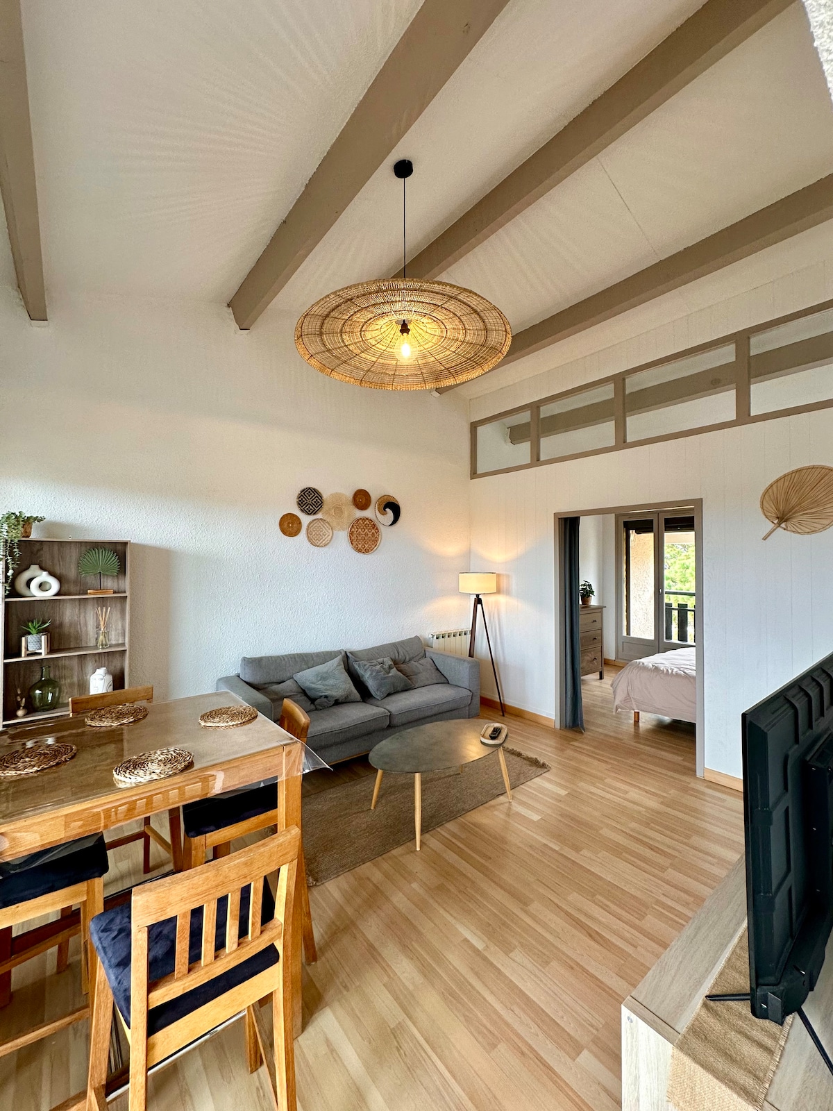 Charmant T2 rénové avec goût et entièrement équipé offrant une vue dégagée sur le lac marin . Le logement dispose d’ une chambre cosy avec lit double et de nombreux rangements , un coin salon avec un canapé convertible 2 places , un coin cuisine entièrement équipé donnant sur la loggia. Situé dans une résidence calme , ce bel appartement lumineux dispose d’une place de parking attitrée . Situé à proximité de tous commerces, à 5 minutes en voiture de la plage et à 35 Km de l’Espagne.