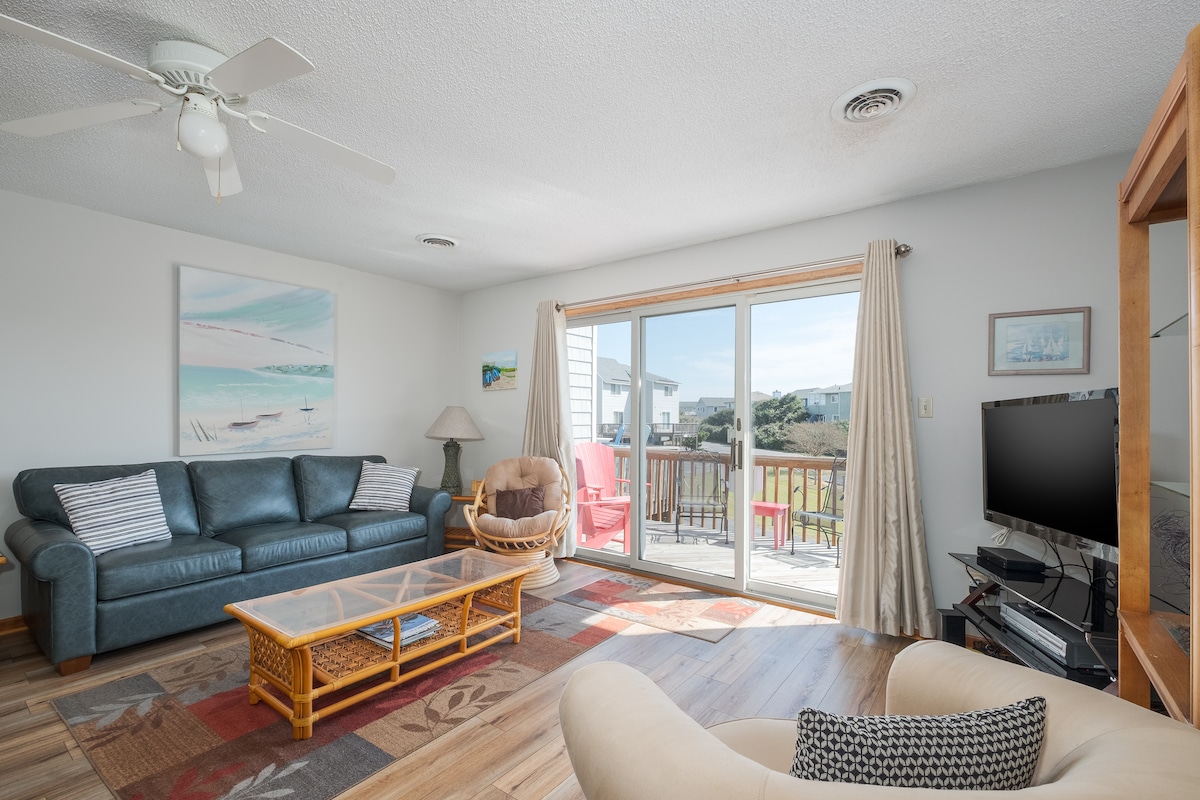 Brīnišķīga 2 guļamistabu rindu māja ar "pastkartes" skatu uz okeānu no Master balkona. Okeāna puse, īsa (2 minūšu) pastaiga līdz pludmalei. Atpūtieties pie viļņiem, šļakstieties kopienas baseinā vai spēlējiet tenisu kopienas laukumā. Izbaudiet atpūtu brīvā dabā no trim terasēm vai pavadiet ģimenes vakaru ar spēlēm un puzlēm. Izbaudiet dažus no labākajiem ēdieniem un iepirkšanos OBX gar Pīļu dēļu celiņu, kas atrodas 1/2 jūdzes attālumā pa relaksējošo Pīļu taku. Izīrēšana no piektdienas līdz piektdienai; ziņojums par citiem pasākumiem.