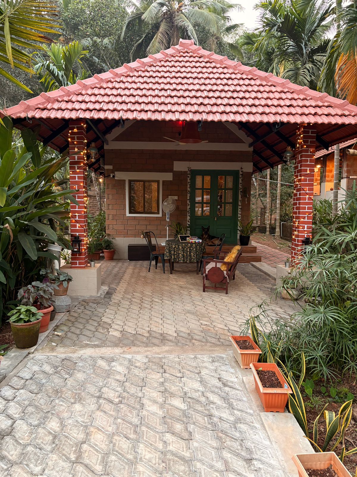 Tucked away in nature's embrace, Tara in Karkala offers a getaway from city life. Surrounded by woods and rice fields, it paints a perfect scenic picture. The house designed with a rustic and antique feel, yet with modern amenities, made from local materials, is complemented by its surroundings, making you feel at peace. Wake up to the sound of peacocks in the morning. Behind the home, a spacious garden and pond to spend your evenings making pizza and getting lost with nature.