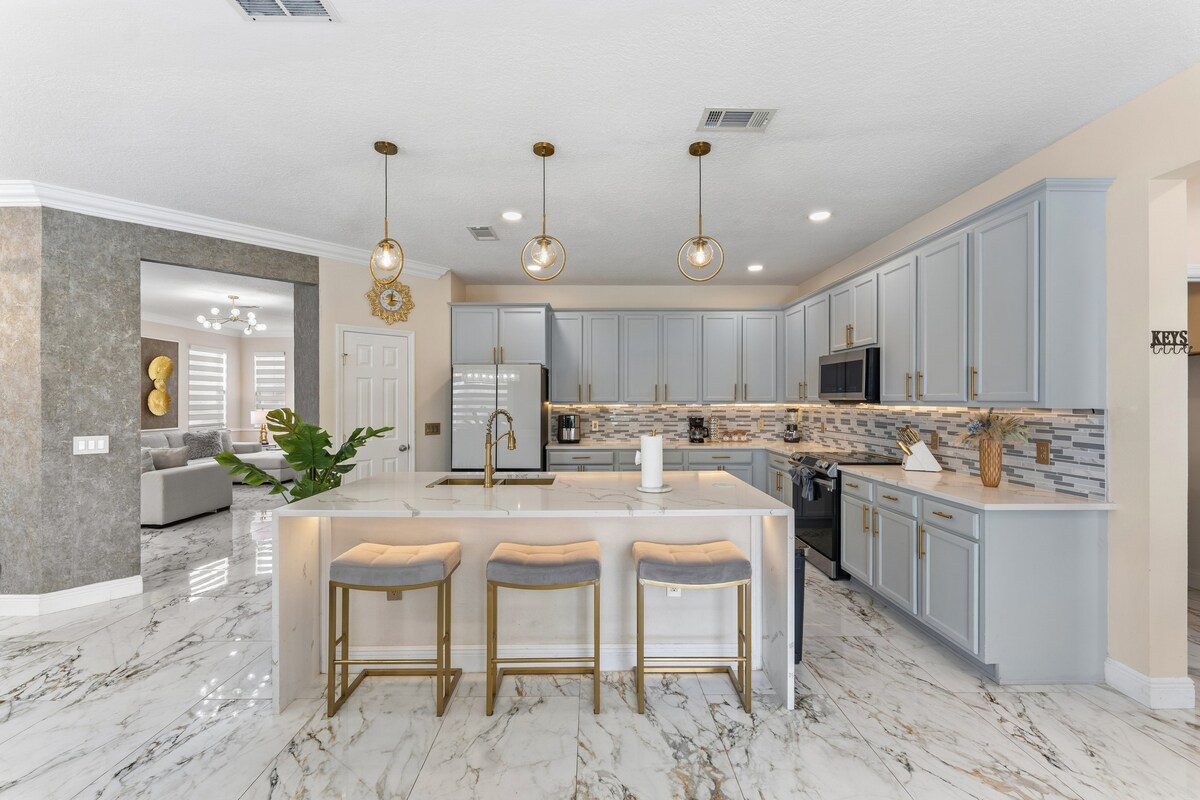 Relax with the whole family at this Stylish Magazine Style house in Davenport, just miles from Disney World Orlando Florida Theme Parks, Universal Studios, Sea World and Legoland. Enjoy our PRIVATE POOL and optional WATER HEATER & GRILL. 4 bedrooms, 2.5 bathrooms, fully equipped kitchen, Smart TV's and strong Wi-Fi all around the house. Themed Games Room in the Garage with Smart TV, Full Size Pool Table & Air Hockey. Close to Posner Village Outdoor Mall, Restaurants & Retail stores.