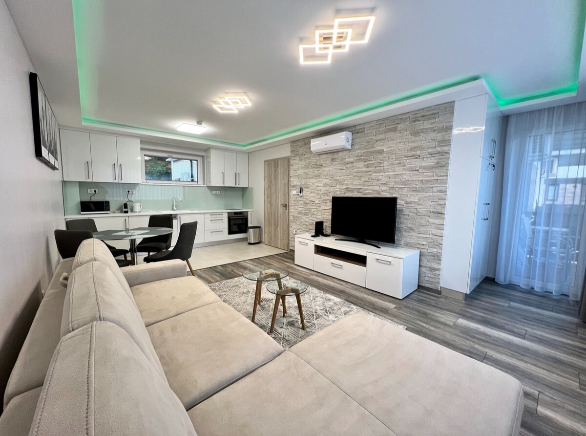 Pilnībā aprīkots, moderns dzīvoklis, kas noteikti būs kā attēlots tiešraidē. Dzīvoklis atrodas 4. stāvā, ir lifts. Pēc pieprasījuma piedāvāju bezmaksas autostāvvietu. SVARĪGI: lūdzu, norādiet to rezervācijas laikā, jo barjeru var atvērt ar tālvadības pulti! Mājoklī ir pieejams Wi-Fi, Netflix. Dzīvokļu parkā ir arī restorāns, pirmās nepieciešamības preču veikals, aptieka. Fēns, dvieļi, ķermeņa ziepes, gultasveļa, kafija un tēja - neņemiet tos līdzi!
