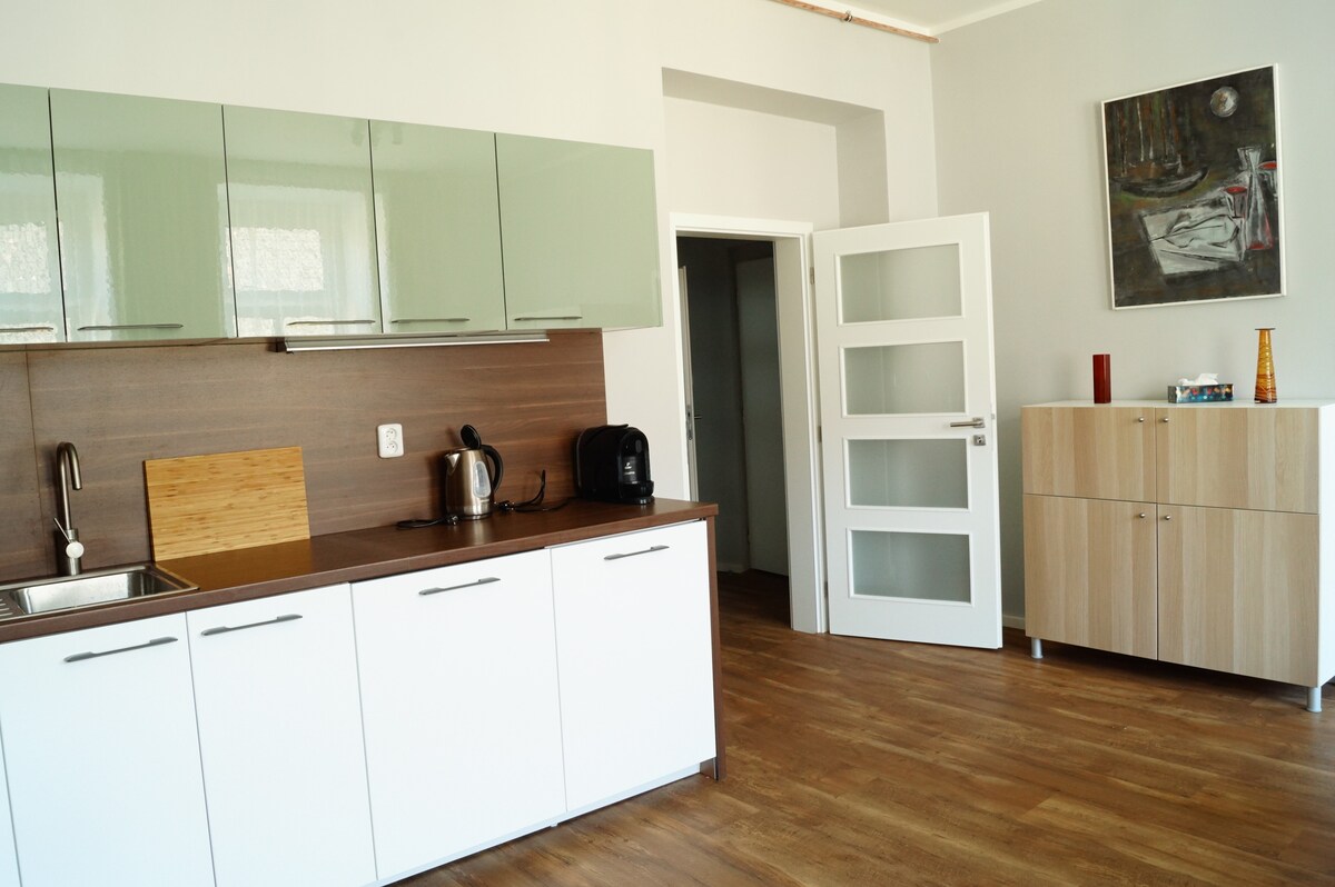 Discover the charm of Děčín in our cozy apartment that makes you feel right at home. The main train station is just 3 minutes away, offering direct connections to Dresden (1 hr) and Prague (1.2 hrs). Buses (2 min) take you to Bohemian Switzerland or Tisá Walls. We provide storage for bikes/strollers; hypermarkets and supermarkets are within 5 min. Parking by the house (paid) or 2 min free. We'll gladly recommend the best our region offers. We look forward to your visit :)