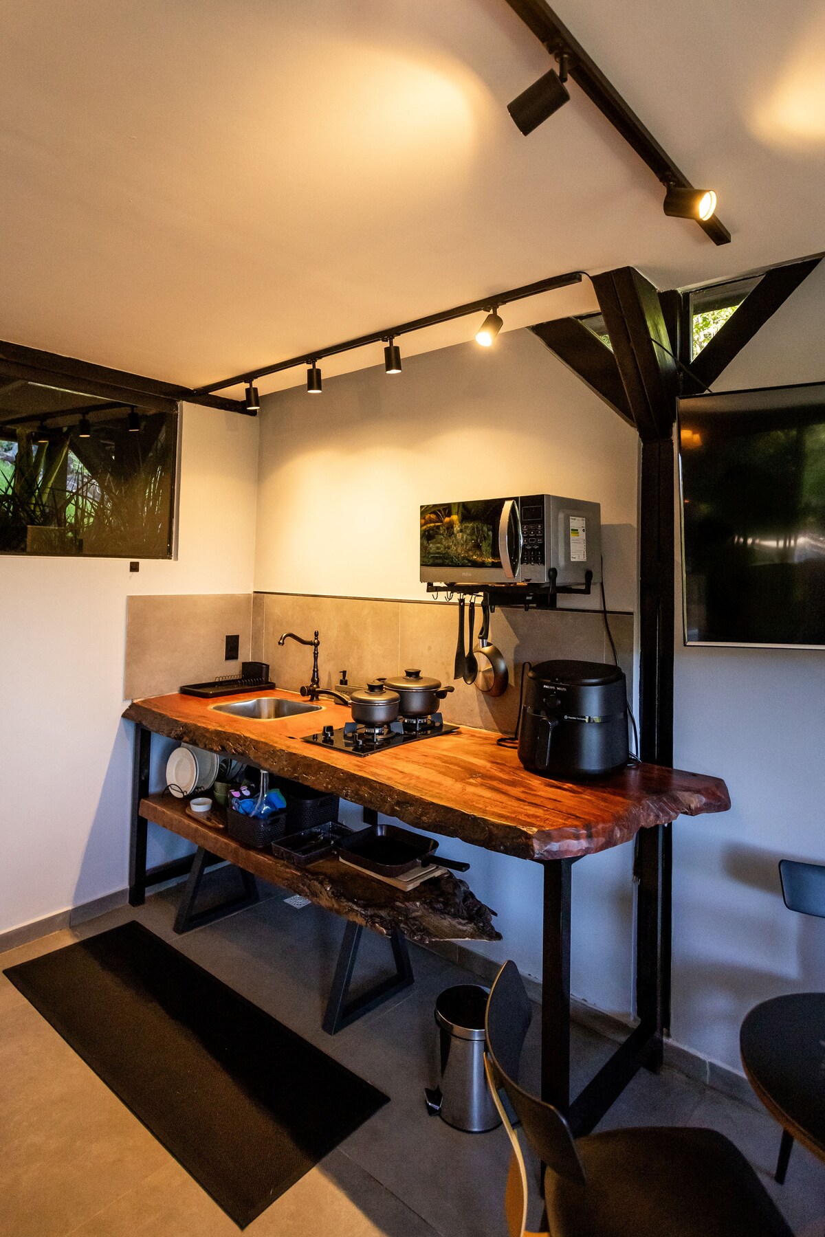 Sveiki! Laipni lūdzam! Sīkmājai ir diferencēts dizains, kas pilnībā integrējas ar dabu. Privāta, autonoma un pilnībā privāta māja. Uzturēšanās ārpusē vai iekšpusē ir gandrīz vienlīdz patīkama. Mājīgā atmosfēra mājas iekšpusē, pateicoties lielo durvju un stikla sienu dominējošajai gaisotnei, rada klātesošu apgaismojumu un dabas smaržu, kas iekļūst telpā, sniedz patīkamu labsajūtas un saiknes sajūtu ar dabu. Nāciet un izbaudiet šo piedzīvojumu!