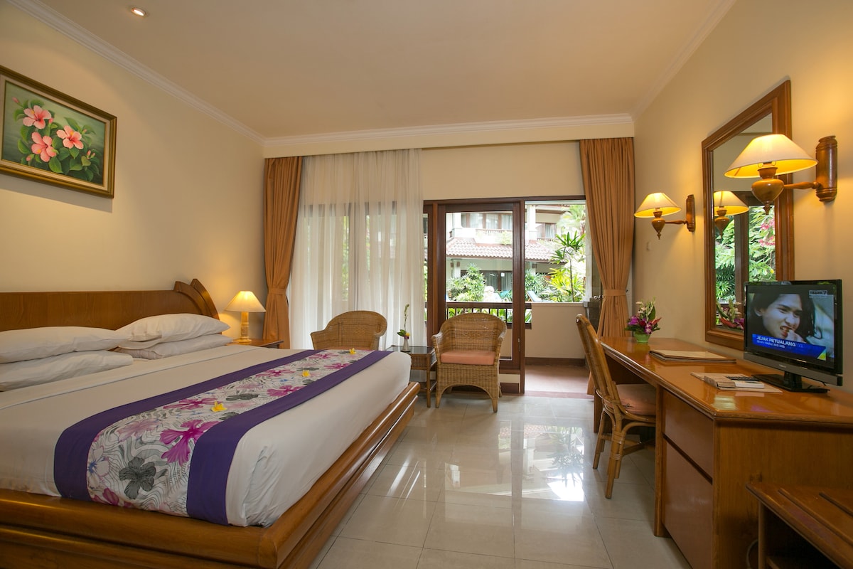 Izbaudiet ērtu piekļuvi populāriem veikaliem, kafejnīcai vai Sanur Harbor, ja vēlaties izbaudīt salas hop uz Nusa Penida /Nusa Lembongan no šīs burvīgās vietas. Pastaiga līdz pludmalei aptuveni 5 minūtes, un numurā ir iekļautas ikdienas brokastis. Veicot rezervāciju, apstipriniet gultas veidu (divguļamo vai divguļamo gultu). Jūsu rezervācijā ir iekļauts AC, TV, WiFi, ūdens tējkanna, kafija /tēja, burbuļvanna, mini ledusskapis, tualetes piederumi, vanna un privāts balkons /terase. Pēc pieprasījuma ir pieejams gludeklis, bērnu gultiņa un fēns.