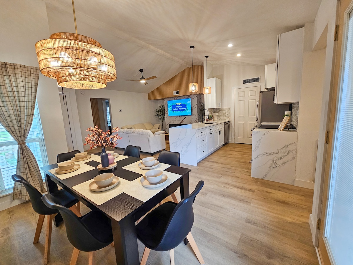 Laipni lūdzam jūsu stilīgajā un ērtajā atpūtā Kolonijā, Teksasā! Šis modernais organiskais mājoklis ir veidots ar moderniem akcentiem, lai padarītu jūsu uzturēšanos neaizmirstami apstrādātu apgaismojumu, akcenta sienas, kamīnu, ūdenskritumu letes un nerūsējošā tērauda ierīces rada elegantu, bet mājīgu atmosfēru. Neatkarīgi no tā, vai apmeklējat darījumu braucienus, sportu, iepirkšanos vai atpūtu, šis mājoklis atrodas dažu minūšu attālumā no tādām populārākajām apskates vietām kā The Star, PGA Parkway, Grandscape, World Springs, Legacy West & Shops at Legacy.