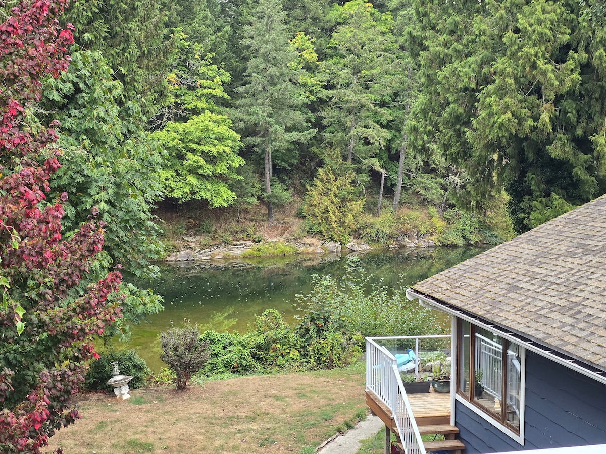 Padariet savu Nanaimo apmeklējumu ar relaksējošu uzlādi Fiddling Frog viesu apartamentos. Jūsu privātais spilventiņš, kas atrodas starp nomierinošajām Linlijas ielejas dzegām un skaisto Džordžijas šauruma plašumu, ir ideāla vieta mājīgai atpūtai vai mierīgai atpūtai darbā. Izbaudiet satriecošu saullēktu no terases ar skatu uz okeānu vai kādu no tuvumā esošajām pludmalēm. Vai arī atpūtieties mūsu luksusa "king" izmēra gultā un izbaudiet lietainu dienu pilsētā. Komforts un relaksācija jau ir klāt - pārējais ir jūsu ziņā!