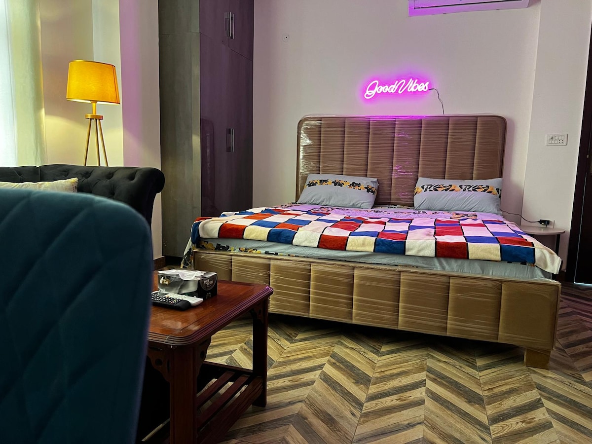 Izbaudiet dizaineru dzīvi Luniq, tikai dažu soļu attālumā no MM Alam Road, Lahoras kafejnīcu, veikalu un naktsdzīves sirds. • 🛋️ Estētiska atpūtas telpa ar mājīgiem paklājiem, piekaramo lampu un pilna garuma aizkariem. • 🛏️ Ērta King izmēra gulta ar augstākās kvalitātes gultasveļu un skatu uz pilsētu. • 55 collu Android Smart TV ar Netflix un YouTube Premium • 🍳 Pilnībā aprīkota moderna virtuve ar pamataprīkojumu • ⚡ Ātrs Wi-Fi darbam vai straumēšanai • 🔑 Ērta pašreģistrēšanās, lai nodrošinātu pilnīgu privātumu • 🌆 Galvenā Gulbergas atrašanās vieta