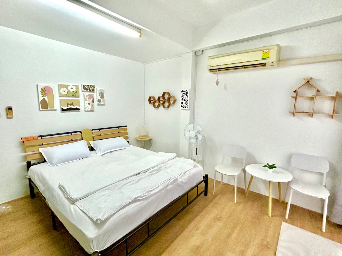 Viena guļamistaba blakus Huaykwang MRT stacijai Māja atrodas Huaykwang krustojumā, vienas guļamistabas diagonāli pretī ziloņu templim, kopienas kreisajā pusē atrodas Huihuang metro stacija, un labajā pusē ir slavenā Huaykwang iepirkšanās iela Taizemē.Tā ir labi savienota un ērta, un istaba ir plaša un ar modernām papildērtībām pārim vai viesim, kas ceļo vienatnē. Privāta māja ar ērtu divguļamo gultu, Wi-Fi, gaisa kondicionieri, TV, privātu vannasistabu, terasi un atsevišķu virtuvi jūsu ikdienas vajadzībām. Jauka un mājīga vide ar bezmaksas sporta zāli un bezgalības baseinu dzīvokļa augšstāvā piedāvā unikālu miera sajūtu, vienlaikus vērojot pilsētas rosību.