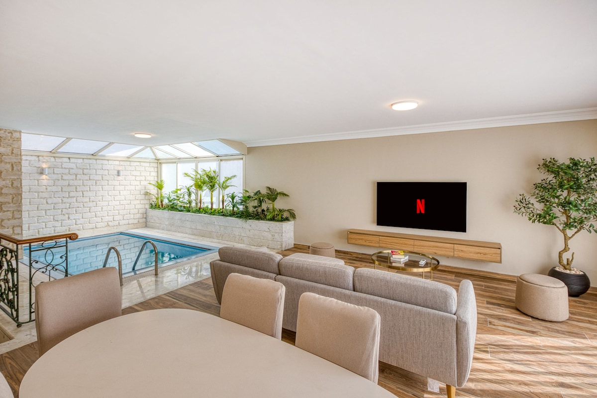 Laipni lūdzam unikālā 3-BR dzīvoklī ar privātu baseinu un āra jumtu, kas atrodas pašā Geziret ELArab Mohandessin centrā, Gamet El-Dowal El-Arabia ielā. Šī izcilā atrašanās vieta ir soļu attālumā no populārākajām kafejnīcām, veikaliem un vietējiem apskates objektiem. Dzīvoklis piedāvā retu komforta, telpu un izcilu funkciju apvienojumu, kas ir ideāli piemērots gan atpūtai, gan izklaidei ar milzīgām 75collu viedtelevīzijas kino noskaņām mājās! Ideāli piemērots ģimenēm vai grupām, kas vēlas baudīt Kairu stilīgi un ērti.