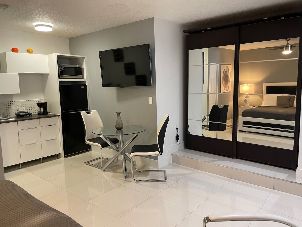 - PILNĪGI PRIVĀTA, SKAISTA STUDIJA Skaista studija netālu no visa!!! 5 minūšu attālumā no Airpot, Wynwood, Design District, South Beach, Port, Brickell, AAA, - King izmēra gulta. - Privāta autostāvvieta - Pilnībā aprīkota virtuve, kā arī Wi-Fi, viedā televīzija - 6 zvaigžņu viesmīlība - Veļasmašīna un žāvētājs telpās, ko izmantot bez maksas - Īpašums ir viens no četriem Airbnb mājokļiem īpašumā - Nodeva par mīļdzīvnieku 100 $ - par uzturēšanos. Piezīme: divi mīļdzīvnieki, maksātu 150 $ par uzturēšanās reizi ( neattiecas uz ilgtermiņa rezervācijām)