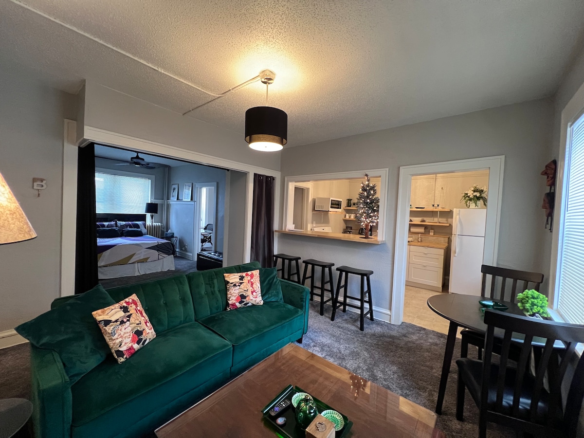Cozy, clean apartment, safe area, dog friendly ($25 additional fee per dog). 1 bedroom w/king bed and 1 cot and couch available for 2 additional guests. Close to Lake Superior, Lester park (MTB biking, hiking, paddling, ski trails with lights till 10 PM), 5.5 miles to Bentleyville (biggest holiday attraction in MN), 2 blocks to lake walk, great for biking, running, walking & rollerblading. Pizza, coffee shop, park & gym all within 2-4 blocks in a beautiful, family friendly area neighborhood.