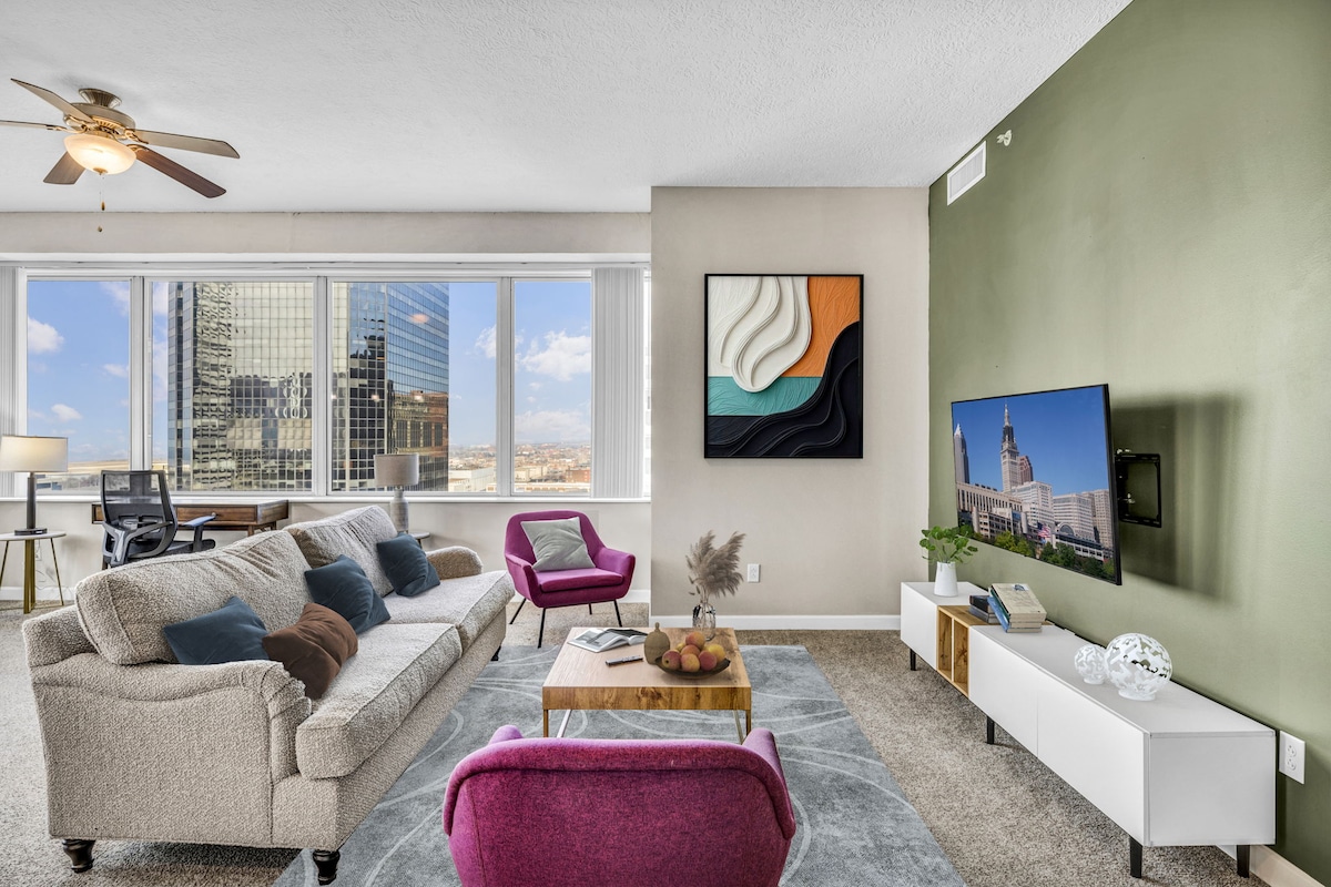 Stay comfortably in Cleveland with this well-located apartment near CSU, Playhouse Square, and top attractions. Perfect for families and sports fans, you’ll be minutes from Rocket Mortgage FieldHouse, Progressive Field, and Browns Stadium. Enjoy free High-Speed Wi-Fi, AC/heating, in-apartment washer & dryer, gym with Sauna (in the building), and nearby shopping/parking. Quiet and convenient, your ideal home base in vibrant downtown Cleveland near major attractions.