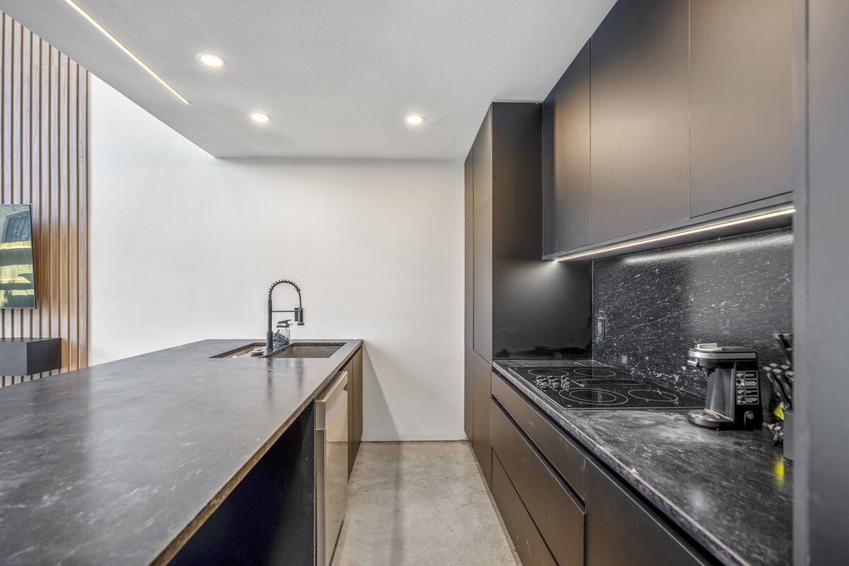 Izbaudiet izsmalcinātu pilsētas dzīvi The O'Four Lofts | Lumen Lux. Šim gaišajam, modernajam Eiropas loftam ir augsti griesti, betona grīdas un rūpīgi atlasīta dizaina apdare. Atvērtā dzīvojamā telpa pāriet elegantā, pilnībā aprīkotā virtuvē ar integrētu apgaismojumu un iebūvētu luksusa ledusskapi – ideāli piemērota viesu uzņemšanai. Izejiet uz privātā balkona un izbaudiet skatu uz pilsētu tikai dažu minūšu attālumā no Hjūstonas centra.