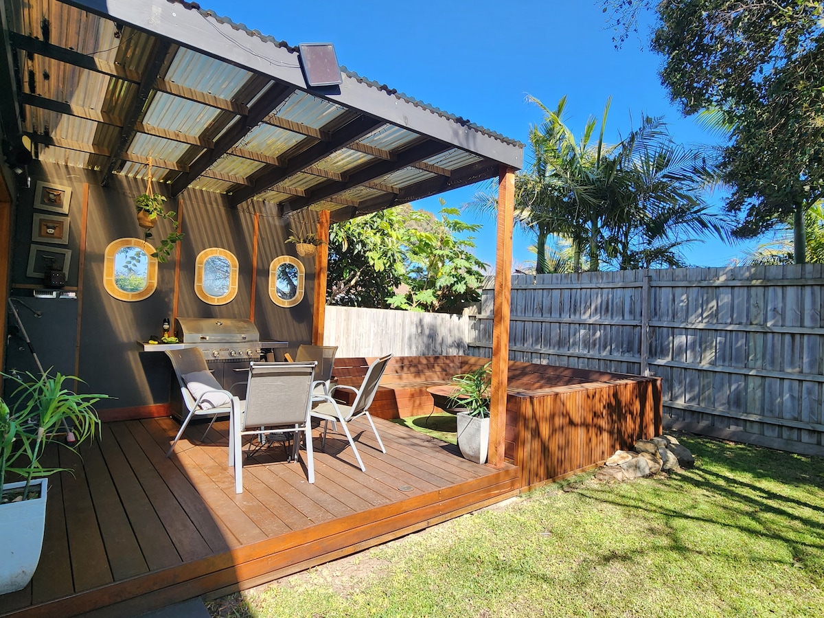 Skaists, moderns, atvērts plānojums, ar gaisa kondicionētāju, bezmaksas Wi-Fi, Netflix , 2 lieliem televizoriem, greznu divguļamo gultu, lielu dušu, sildlampām, fēnu, šampūnu, kondicionieri, veļasmašīnu un žāvētāju un pilnībā aprīkotu virtuvi, ar akmens soliem, trauku mazgājamo mašīnu, indukcijas plīts virsmu, konvekcijas cepeškrāsni/mikro, gaisa fritieri, kafijas automātu un visu, kas jums būtu nepieciešams, lai pagatavotu lielisku maltīti. Ir klājs ar bbq un nelielu privātu pagalmu. Vienība nav paredzēta skolēnām.
