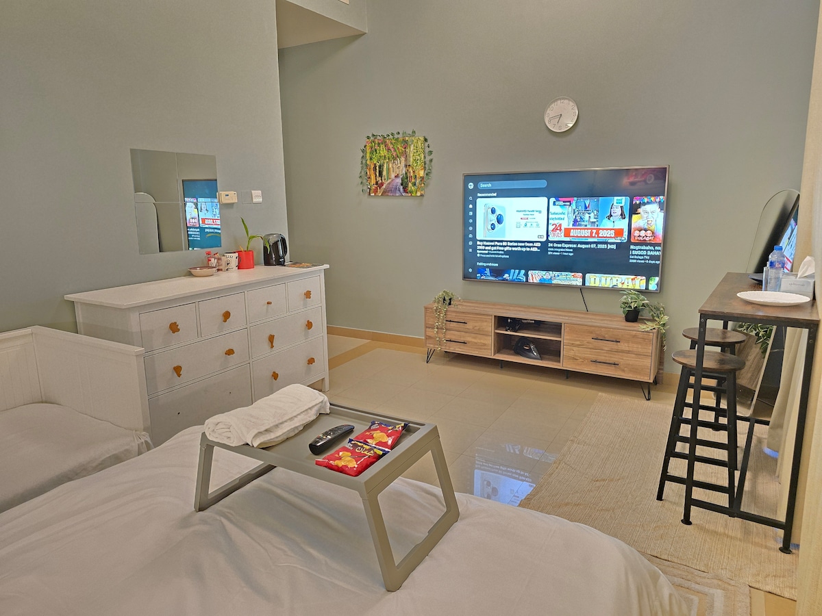 Elegants studijas tipa dzīvoklis sirdī, no kura paveras skats uz siluetu. Tikai 7 minūšu gājiena attālumā no Dubaijas un varenā Burj Khalifa. Pilnībā noslogots jūsu ceļojumam, tūristiem vai darījumu braucieniem, ar visu nepieciešamo, ko varat vēlēties. Luxe viesnīcas stila gultasveļa un dvieļi, lai nodrošinātu īpaši ērtu pieskārienu. Turklāt nodrošiniet bezmaksas piekļuvi pilnībā sakrautai sporta zālei tieši tajā pašā ēkā, kā arī jaukam bezgalības baseinam ārpus telpām!