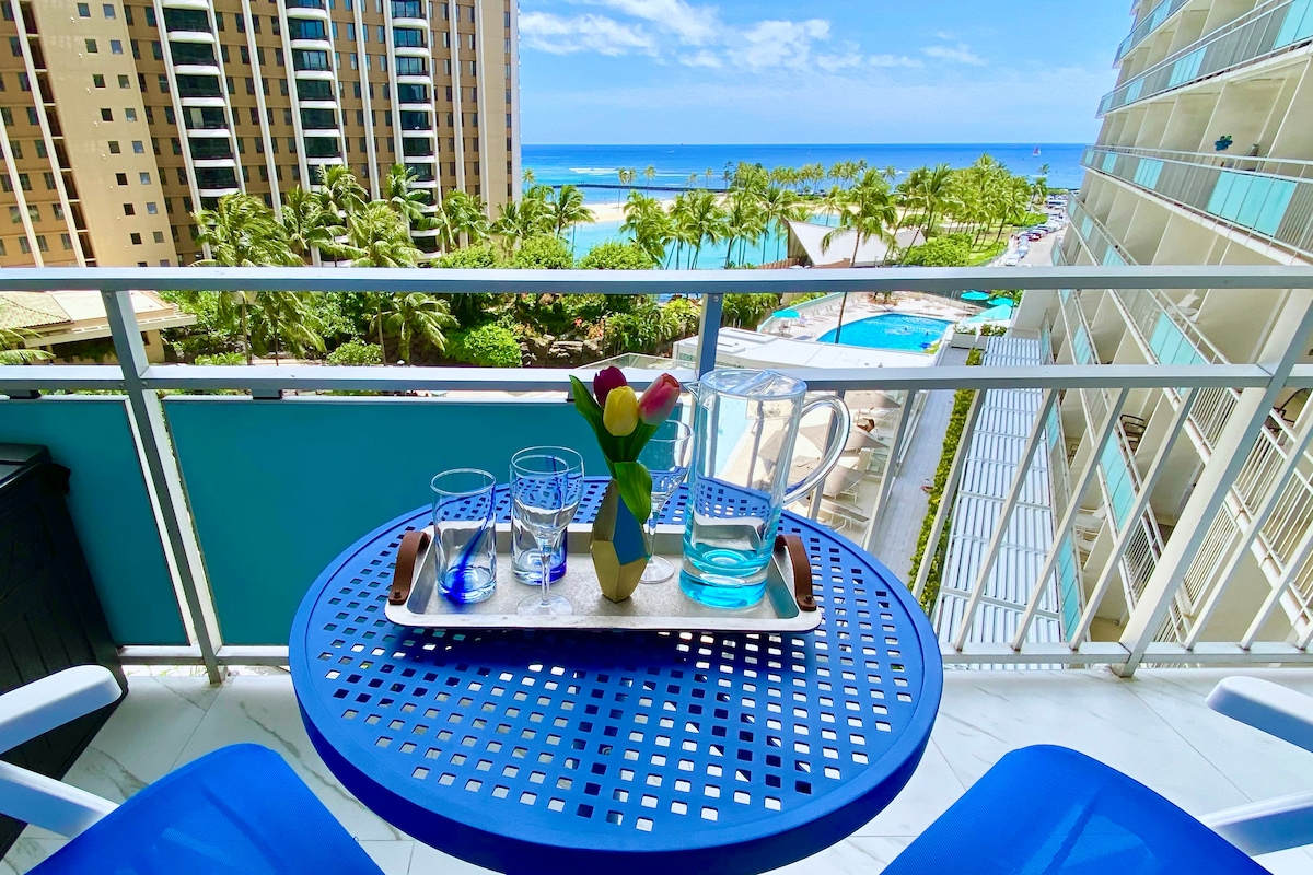 Atjaunots 1 guļamistabas/1 vannasistabas augšstāva dzīvoklis Vaikiki. Skaists 180 netraucēts panorāmas skats uz okeānu no Džuljetas balkona. Skatiet piektdienas vakara uguņošanu un saulrietu no augšas! Guļamistabā ir divguļamā gulta (Queen) Vannasistabā ir divvietīga izlietne, stikla duša. Pilnībā aprīkota virtuve. Diennakts apsardze uz vietas. Centrālā gaisa kondicionieris, kabeļtelevīzija, iekļauts Wi-Fi. Autostāvvieta garāžā pieejama par 33 $ dienā. Piecu minūšu gājiena attālumā atrodas Vaikiki pludmale, Hilton viesnīca, Duke lagūna un tirdzniecības centrs Ala Moana