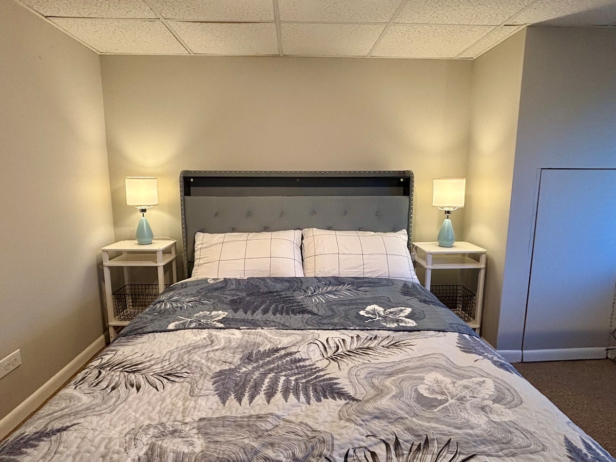 1 King bedroom and hall bath. Private deck. Other rooms will be locked. For more beds please visit our other listings for this home. Parking available for 2 cars in driveway. This home is a house split in two and the other side is separate unit with its own exterior door. The units do not connect inside anymore and is double drywalled up over a locked metal door similar to connecting hotel rooms. Wonderful safe neighborhood. Well stocked kitchen for nearly anything you need.
