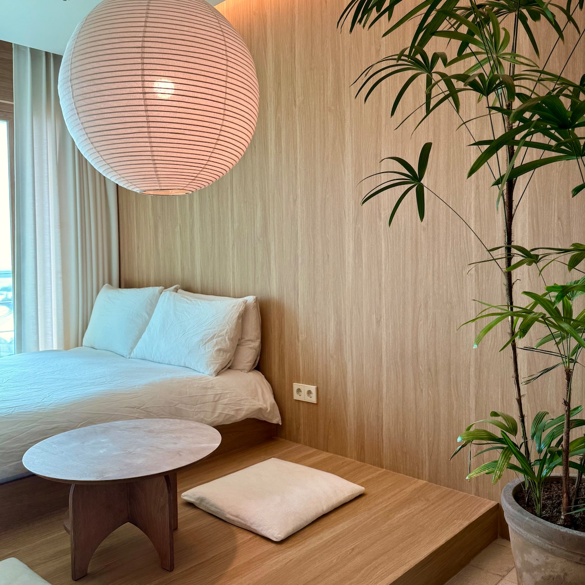 Dimanta tilts, kas pazīstams kā Gwangan tilts, atrodas vistuvāk Busanai ar skatu uz Gwangan tiltu. Tā ir stilīga jauna naktsmītne, no kuras paveras vislabākais skats uz Busanu no Haeundae Dongbaek salas un Yongho-dong. Tas atrodas minūtes attālumā no Gwangalli pludmales un Ginesa pasaules rekordu grāmatas ar lielāko Sašimi centru, krastmalas parku, Starbucks un daudzām citām lietām, ko apskatīt un darīt. Es iedomājos vietu, kur varu no tā visa atpūsties uzreiz. Telpas unikalitāte un pārmērība var sniegt šī brīža gandarījumu un jutīgumu, taču tas nepaliks ilgi. Mēs vēlējāmies radīt harmonisku telpu ar komfortu, ko jūtat uzturēšanās laikā, smalku un ilgstošu jutīgumu un skaistu skatu, kas nesaskaņojas. Grūti plānotā ceļojuma laikā jūs iegrimsiet Sinabro Gwangalli brīnišķīgajā jūrā un telpā.