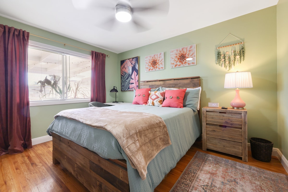 Laipni lūdzam jūsu saulainajā SoCal apartamentos! Atpūtieties klusā, saulē izgaismotā guļamistabā un izbaudiet ērtu divguļamo gultu. Apartamentiem ir kopīga siena ar pārējo māju, taču tie ir pilnīgi atsevišķi un ar atsevišķu ieeju. Durvis, kas savieno apartamentu zāli ar pārējo māju, vienmēr ir aizslēgtas. Mūsu klusā apkaime atrodas 8 minūšu gājiena attālumā no milzīga parka ar rotaļu laukumu un suņu parku un tikai 20 minūšu brauciena attālumā no pludmalēm, pilsētas centra, Sea World un zooloģiskā dārza.