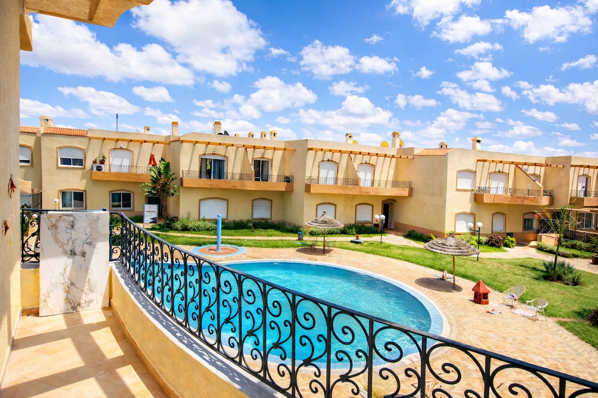 Sidi Bouzid komūnā mouly abdellah, skaists dzīvoklis ar baseinu un dārzu, ir galvenā guļamistaba ar vannasistabu, brīva vai bērna istaba, viesistaba ar plakanā ekrāna televizoru, ēdamzona, pilnībā aprīkota virtuve un balkons ar skatu uz baseinu. Tikai 1,5 stundu attālumā no Mohamed V Kasablankas starptautiskās lidostas, 20 km attālumā no Mazaganbīčas golfa laukuma, 5 km attālumā no El Džadidas, 5 minūšu gājiena attālumā no tirdzniecības centra un 2 soļu attālumā no skaistās Sidi Bouzid pludmales.