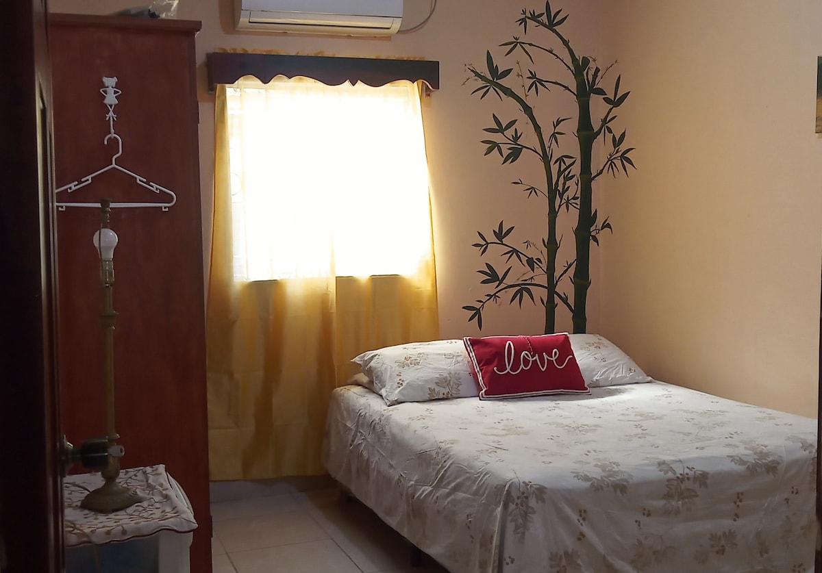 Burvīgs jauns dzīvoklis ar mājīgu mēbelētu istabu, kas ir ideāli piemērota baudīšanai kopā ar pavadoni, ar aprīkotu virtuvi (ledusskapi, mikroviļņu krāsni, elektrisko plīti, tosteri, elektrisko tējkannu), vannasistabu, gaisa kondicionētāju un darba vietu, kā arī terasi ar skaistu skatu uz ceibas koku. Lieliska atrašanās vieta ar bruģētu piekļuvi: Pilsētas centrs - 8 min Kabotajes piestātne - 10 min Golosonas starptautiskā lidosta - 20 līdz 25 min Tuvākā aptieka - 3 minūtes