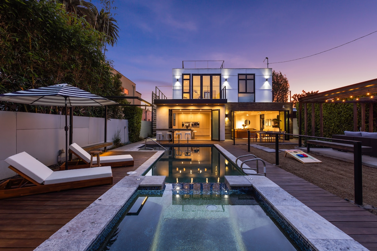 Modern & spacious LA Dream Home: stunning open-plan living area with disappearing 12ft glass doors reveal a serene backyard, infinity-edge pool, hot tub, and outdoor dining beside a cozy fire pit. ☞ Pool + Hot Tub + BBQ ☞ Every Bedroom: bathroom + walk in closet+TV ☞ Private backyard + dogs OK* ☞ Fast wifi + Alexa 10 min → WEHO 20 min → Universal 30 min → DT LA ***SEE HOUSE RULES: The neighborhood is on high alert for disruptive guests. You will be fined $1000 and evicted***