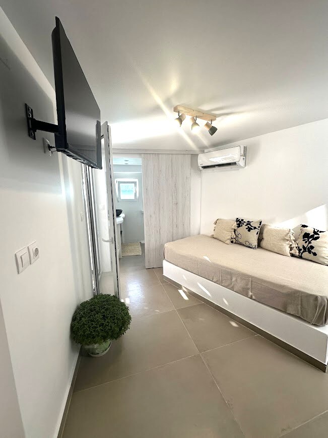 2-istabu dzīvoklis (bez viesistabas), kas ideāli piemērots ģimenēm, uzņēmumiem vai grupām ar mīļdzīvnieku! Atrodas centrā, pastaigas attālumā no Pollonia ciemata. Guļamistabām ir atsevišķa vanna un balkons. Tātad kopā divi balkoni 4,5 kvadrātmetru platībā. No viena balkona paveras skats uz jūru, no otra paveras daļējs skats uz jūru. Ir pieejama arī neliela virtuve
