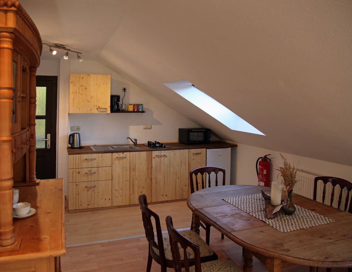 Charmante Ferienwohnung im 1. OG des Landgasthofs "Zur guten Quelle" in Meimers bei Bad Liebenstein. Auf 26 m² findest du alles für eine erholsame Auszeit. Ideal für Paare, kleine Familien oder Gäste mit Hund. Mit Schlafzimmer, Küchennische, ebenerdiger Dusche und privater Sauna im modernen Bad. Ab der 3. Person steht ein zweites Schlafzimmer bereit.