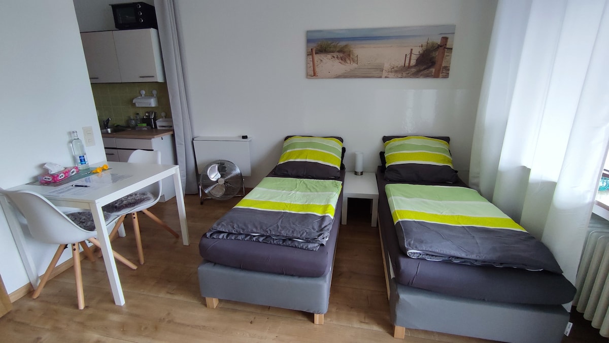 Dzīvoklis atrodas Neheimas centrā nelielā gājēju zonas daļā ar daudzām iepirkšanās un autostāvvietu iespējām tuvākajā apkārtnē. Aptuveni 24 kv.m optimāls 1 personai ar pietiekamu kustību brīvību. Bet pat 2 cilvēkiem to joprojām var diezgan labi izturēt. Liels daļēji pārklāts balkons ar atpūtas zonu un brīnišķīgu panorāmas skatu uz plašo platību. Aprīkojumā ietilpst Wi-Fi, viedtelevīzija un veļas mašīna. Pieejams arī lifts.