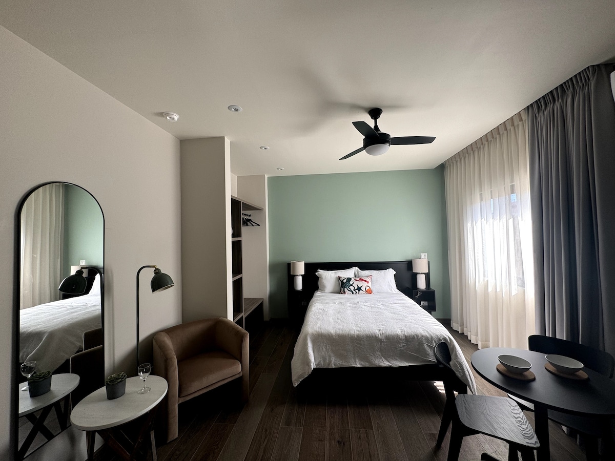 Welcome to our luxury and comfortable studio, designed to provide 5-star experiences for couples. With a King size bed, rain waterfall shower with perfect pressure and temperature, high-speed Wi-Fi, complementary coffee service, sofa-bed for kids, premium finishes and rotating TV, this studio is better than any hotel room or suite. This is a new unit that was finished in October of 2023, with everything out-of-the-box brand new. The stay includes private gated parking. Located at Casas Sanblu.