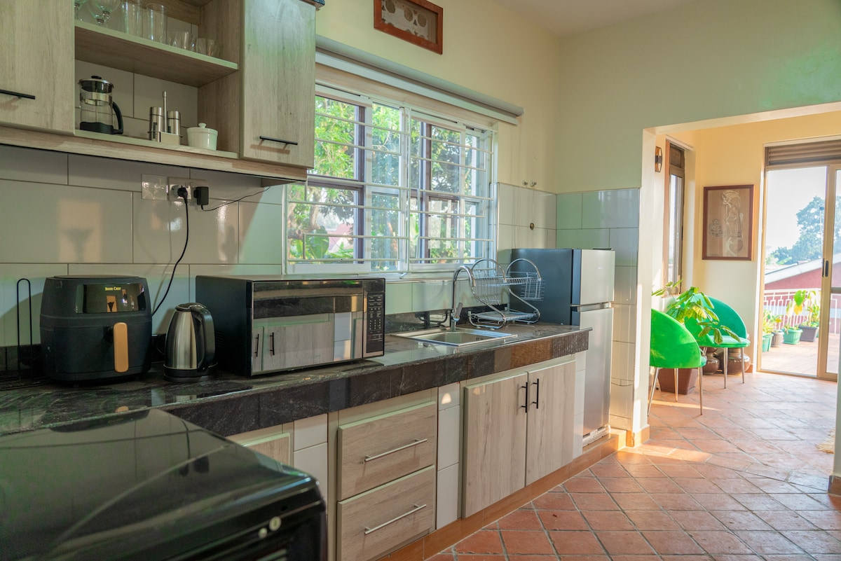 Liels, rāms komplekss ar unikāli būvētu mājokli. Brokastis vai vakariņas āra verandā ir relaksējošs piedzīvojums tieši pie jūsu namdurvīm. Unikālā arhitektūra savieno viesistabu, ēdamistabu un virtuvi tā, it kā tā atrastos vienā telpā. Ar trim guļamistabām šī ir ideāla vieta ģimenei vai pāris draugiem. Mājoklis ir pilnībā aprīkots, ideāli piemērots gan ilgtermiņa, gan īstermiņa rezervācijām. Ņemiet vērā, ka Kampala ik pa laikam piedzīvo elektroenerģijas padeves pārtraukumus, un pašlaik mums nav rezerves.