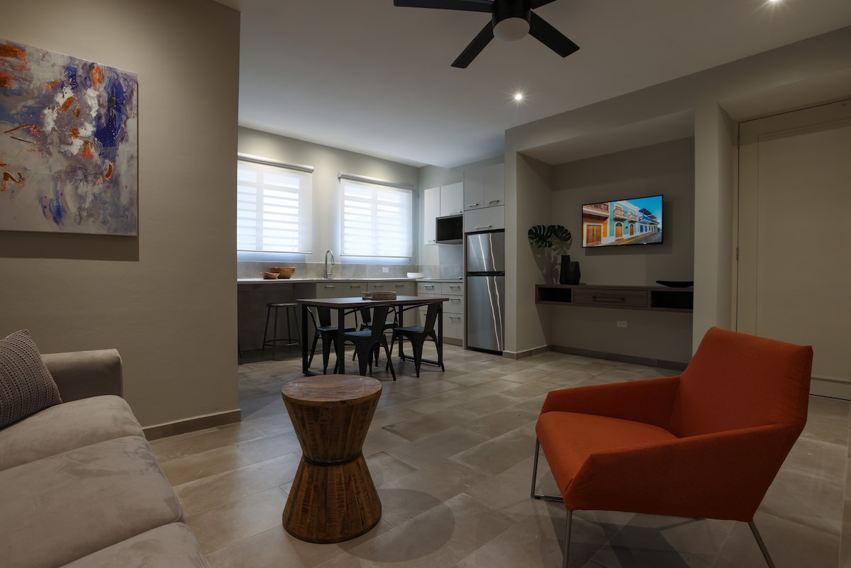Šis greznais mājoklis atrodas modernā, augstā ēkā, kas atrodas senās Sanhuanas salā tikai vienu jūdzi no Spānijas vecpilsētas un netālu no Kondado. Atrašanās vieta ir lieliski piemērota, lai piekļūtu slavenajai El Escambron pludmalei (tikai 1 kvartāla attālumā!), kas ir ļoti populāra sērfotāju vidū. Tas ir tikko atjaunots daudzdzīvokļu mājas lofta stila dārgakmens ar atklātiem betona griestiem un sijām ar grīdas un griestiem uz ziemeļiem vērsti logi stūra mājoklī ar pietiekamu saules gaismu visas dienas garumā.