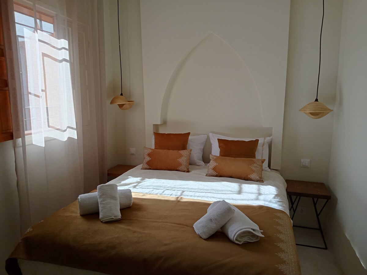 Ryad d'exeption, très calme, juste restauré, alliant charme et poésie. Vous bénéficez d'une vaste chambre élégament décorée avec salle de bain en Tadelakt donnant sur le patio et la fontaine. Sur le toit, une grande terrasse où à l'abri du vent et du soleil, berçé par le bruit des vagues et le ballet des mouettes vous êtes dans la magie pure d'Essaouira... !