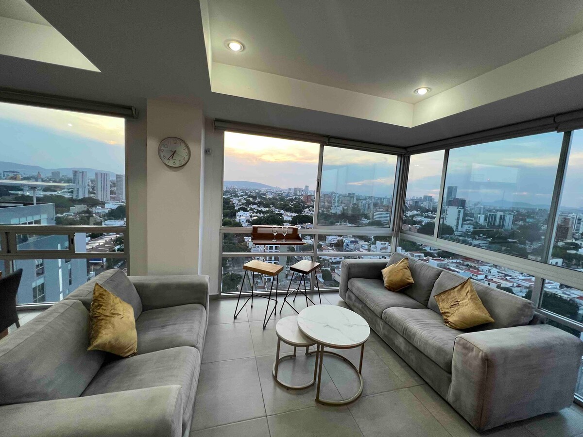Moderns jauns dzīvoklis ar satriecošu skatu uz pilsētu Gvadalaharā. Atrodas drošā tornī ar diennakts apsardzi un privātu autostāvvietu. Tikai 5 min attālumā no Expo Guadalajara, 8 min attālumā no La Minervas un 10 min attālumā no Čapultepekas un Amerikas konsulāta. Ideāli piemērots darījumu braucieniem vai atpūtas braucieniem: ģimenēm, grupām un profesionāļiem. Izbaudiet 2 guļamistabas, 2,5 vannasistabas, gaišu viesistabu, pilnībā aprīkotu virtuvi un ātru Wi-Fi darbam vai atpūtai.