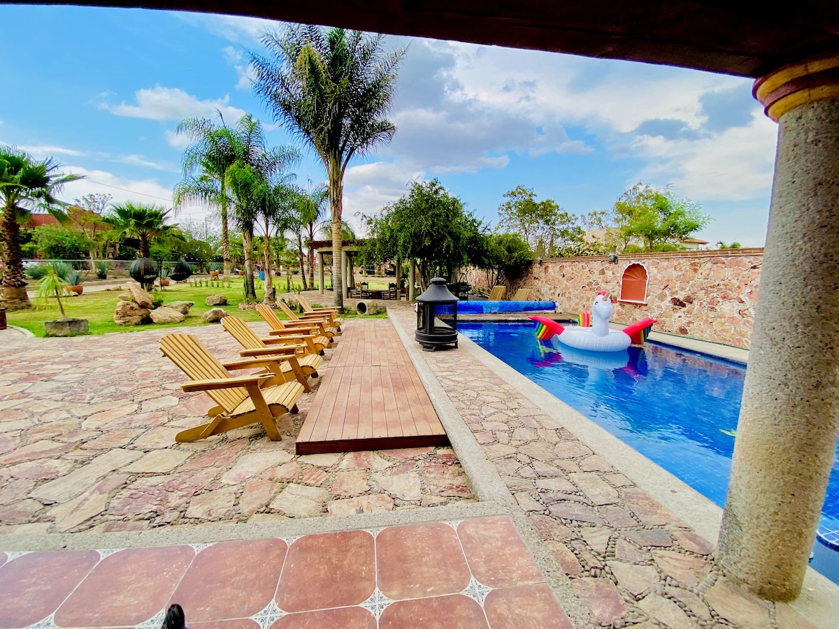 Skaista un ērta meksikāņu stila māja. 8 cilvēkiem, atrodas 10 minūšu brauciena attālumā no Tequis centra, 30 minūšu attālumā no Peña de Bernal un 20 minūšu attālumā no dažādiem vīnogu dārziem. Apsildāms 7x4 baseins ar privātu saules enerģijas sistēmu tikai jums. Grils, ugunskura vieta, kamīns (neietver koksni vai kokogles), strūklaka, džakuzi, aprīkota virtuve, Wi-Fi, 50 collu 4K Smart TV un kabeļtelevīzija, NETFLIX, YouTube. Mēs pieņemam 2 vidēja izmēra mājdzīvniekus par maksu 300 ASV dolāru apmērā (reģistrējiet tos LIETOTNĒ)
