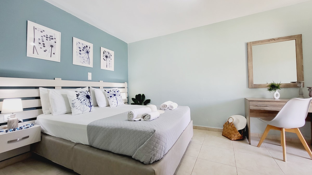 Skaista, ērta un komfortabla 1 guļamistabas studija ar māksliniecisku pavērsienu, kas Jums liksies unikāls! Centrālā, bet klusā vietā, netālu no pludmales un viss, kas nepieciešams jūsu uzturēšanās laikā! Terase noteikti padarīs jūsu uzturēšanos interesantu, jo no tās paveras nenovērtējams panorāmas skats uz jūru.Tā rotaļīgi balansē starp jūras zilo un zemes zaļo. Mavros Molos līča tīrā, sakārtotā pludmale atrodas tikai trīs kvartālu attālumā! Studijā var izmitināt 2 pieaugušos un mazu bērnu!