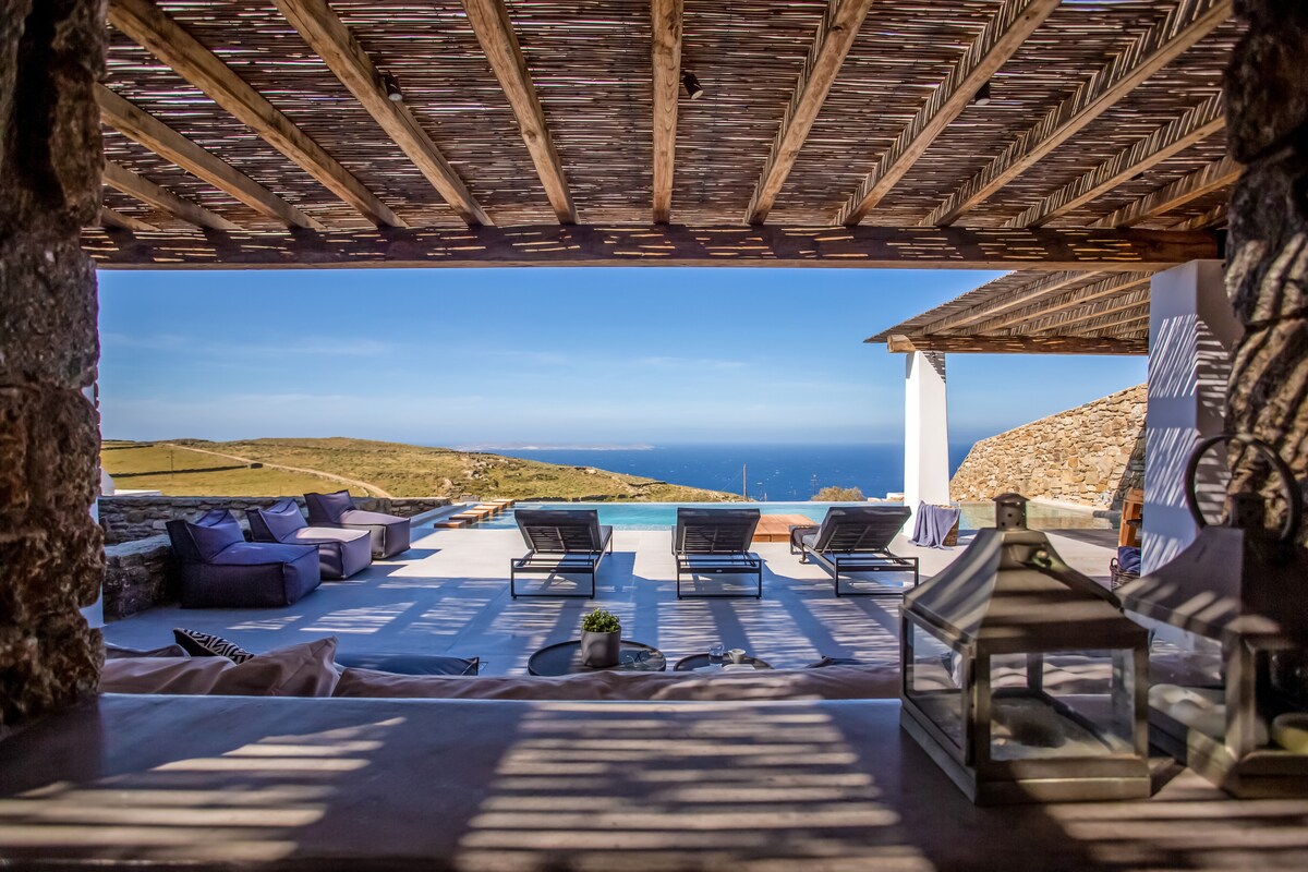 Grezna villa, 250 m2 savrupmāja, 5 km Mikonas pilsēta. Lieliska ārtelpa, skats uz jūru/saulrietu, privāts bezgalības baseins, pilnībā aprīkota āra virtuve, atpūtas un ēdamzona GALVENĀ MĀJA: 3 divguļamās guļamistabas un 3 vannasistabas (2 no tām ar apartamentiem augšējā līmenī) VIESU MĀJA (apakšējais līmenis): 1 divvietīga guļamistaba + virtuves zona ar viesistabu ar dīvāngultu 2 viesiem + viena vannasistaba 2 VIESU ISTABAS ar vannasistabām ar atsevišķu ieeju (baseina līmenī) Pilnībā aprīkots ar gaisa kondicionētāju, WIFI, TV-netflix, privāta autostāvvieta
