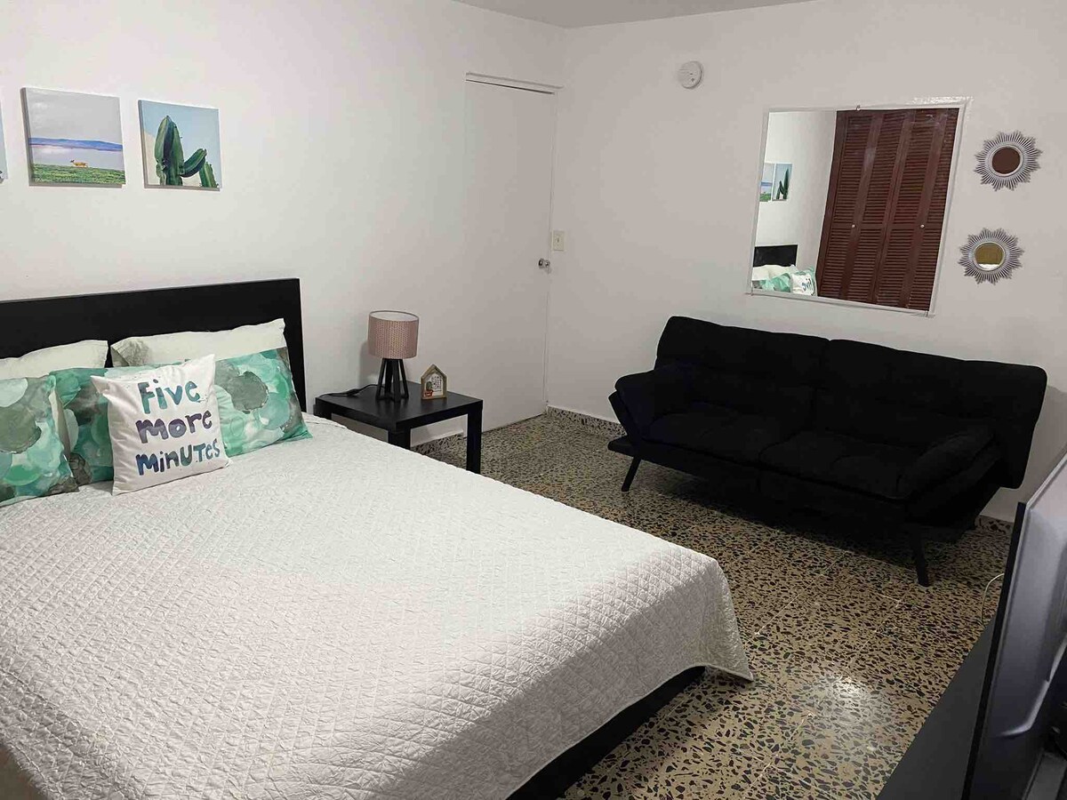 Atpūtieties šajā ērtajā studijā, kas atrodas otrajā līmenī, dažu minūšu attālumā no Barcelonetas ciemata. Mājoklī ir divas vienguļamās gultas, gaisa kondicionētājs, televizors, veļasmašīna un žāvētājs jūsu ērtībai. Pilnībā aprīkota virtuve un viss, kas nepieciešams patīkamai atpūtai. ¡Jūsu ideālā bāze Puertoriko ziemeļu piekrastes iepazīšanai. 🇵🇷