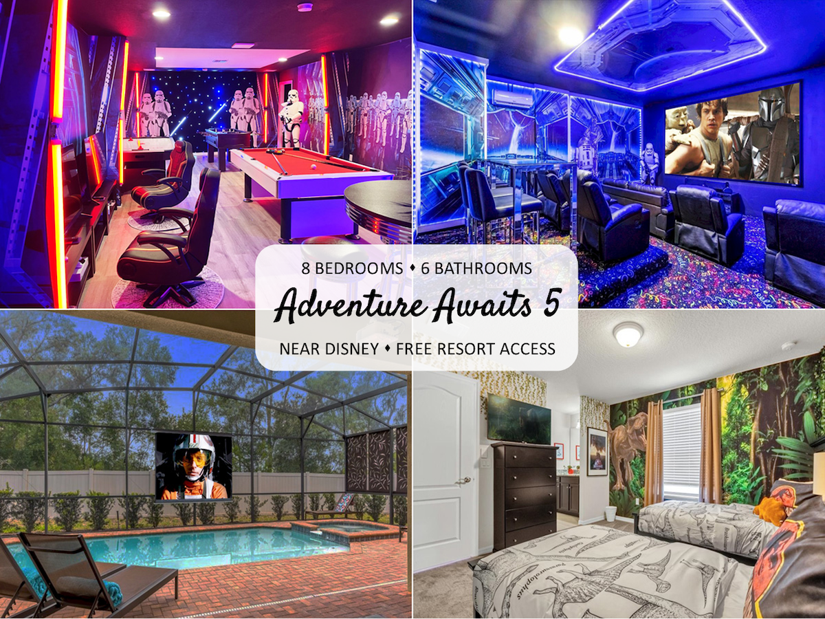 Enjoy our Early Bird Sale and Save! ✨ Discover an enchanting escape at Ice Saber Manor-a stunning 6 bed Villa featuring FROZEN and SPIDER-MAN rooms, 4 gorgeous master suites and endless entertainment options! Immerse yourself in cinematic wonders with a Star Wars MOVIE THEATER, belt out your favorites in the KARAOKE area or revel in our POOLSIDE THEATER! Relax in your heated POOL&SPA or enjoy our WATERPARK! Discover Disney from the comfort of this modern home nestled in a beautiful resort!