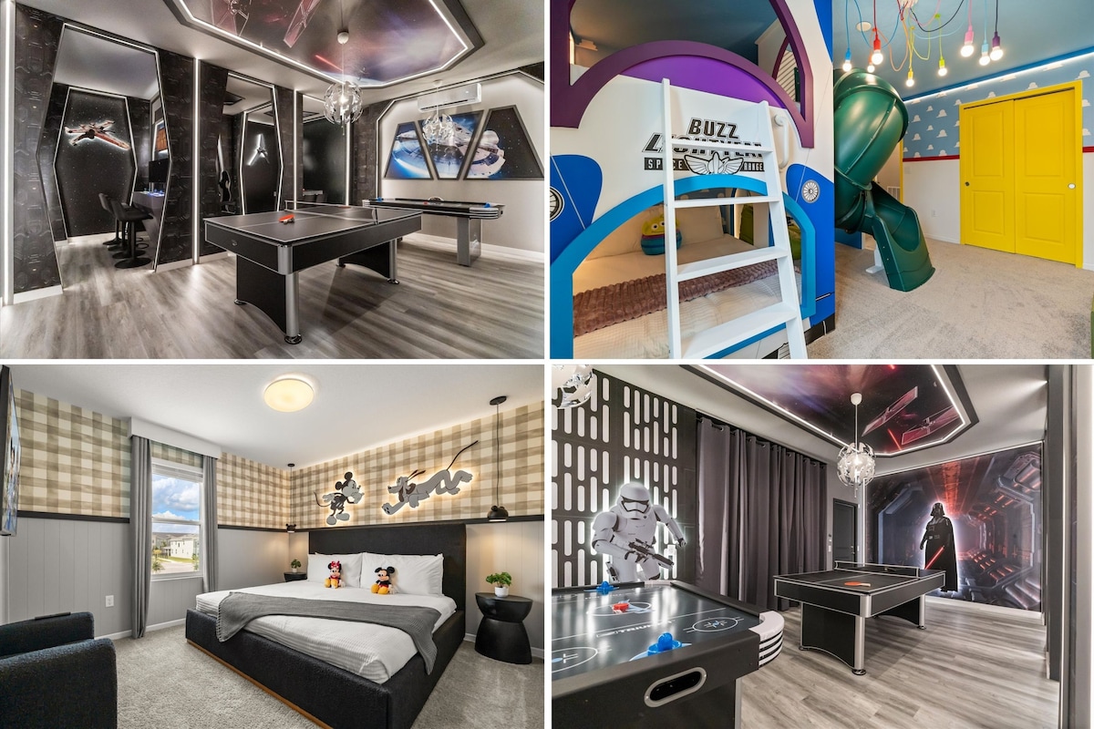 Ideāls STILĪGA DIZAINA līdzsvars, GREZNS KOMFORTS un NEBEIDZAMA IZKLAIDE satriecošajā 3,5 kvadrātjūdžu Reinjonas kūrortā. Jums būs savs privātais baseins, spa, kinoteātris - spēļu istaba, 3 galvenie apartamenti, 3 neticamas tematiskās guļamistabas (MARVEL, SALDĒTA II, NASA) bērniem vai pieaugušajiem, jaunākā Xbox Series X spēļu stacija, 2500 pēdu2 baseina terase ar skatu uz skaistu mežu un dīķi, ugunskura vieta un biljarda galds, minūtes līdz Disnejam.