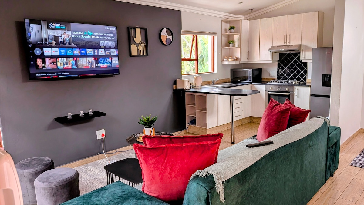We welcome you to relax in our calm and luxurious space situated in a quiet section of Fourways. The apartment is uniquely and tastefully designed with amenities that radiate style and comfort. Treat yourself to this stunning apartment with a queen size bed, a fully equipped kitchen and a modern bathroom. Unwind on the patio or on the couch and enjoy a TV with Netflix and Youtube. The apartment has electricity backup that runs the TV and the Wi-Fi. Book your stay today and indulge in luxury.