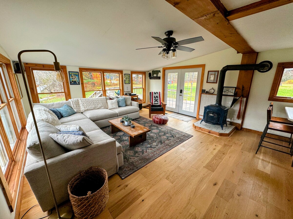 Šis 3 līmeņu, vairāk nekā 1700 kvadrātpēdu slēpošanas kalnu namiņš, kas nesen atjaunots 2023. gada rudenī, atrodas tikai 4 minūšu brauciena attālumā no Okemo kalnu kūrorta un pilsētas, un Džeksons Gors atrodas tikai 6 minūšu attālumā. Logi no grīdas līdz griestiem rāda satriecošus 180 grādu skatus uz meža pagalmu, radot mierīgu atpūtu kalnos. Mājīgi iekārtojieties pie kamīna vai iegremdējieties džakuzi burbuļvannā, lai pilnībā atpūstos. Neatkarīgi no tā, vai esat šeit, lai slēpotu, dotos pārgājienos vai mierīgi aizbēgtu, šī privātā oāze piedāvā nevainojamu komforta un ērtību apvienojumu.