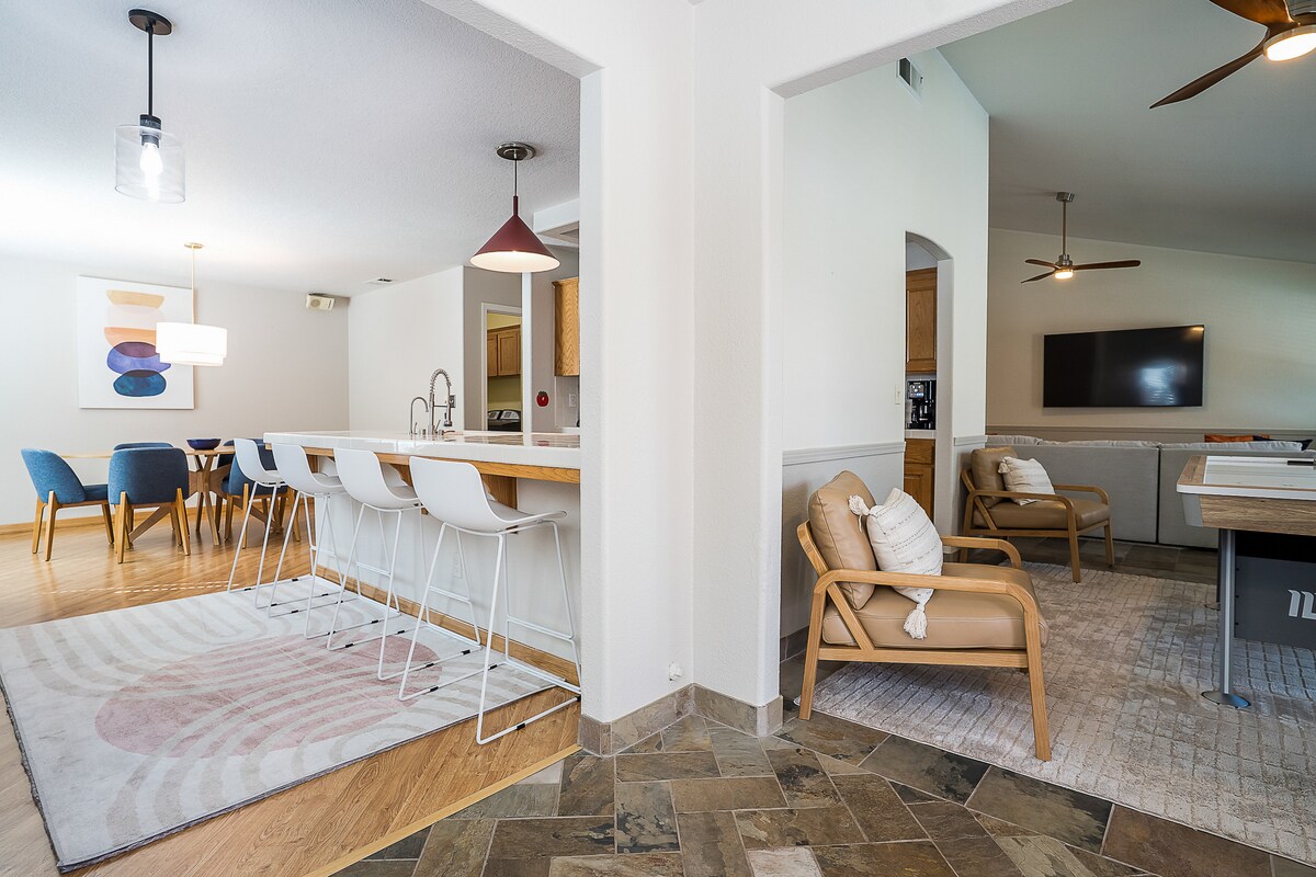 Atpūtieties savā privātajā oāzē šajā nesen pārbūvētajā gadsimta vidus modernajā mājoklī! Ieejot šajā 3 guļamistabu 2 vannasistabu mājoklī, jūs aizvedīs stilīgā gadsimta vidus arhitektūra un modernais retro dekors, kas jūs noteikti iedvesmos! Esam izveidojuši mājīgu, stilīgu un atpūtas vietu, kur jūs un jūsu viesi varat atpūsties iespaidīgajā pagalmā vai vienkārši pavadīt dienu pie mājīgā kamīna, baudot vinilus!