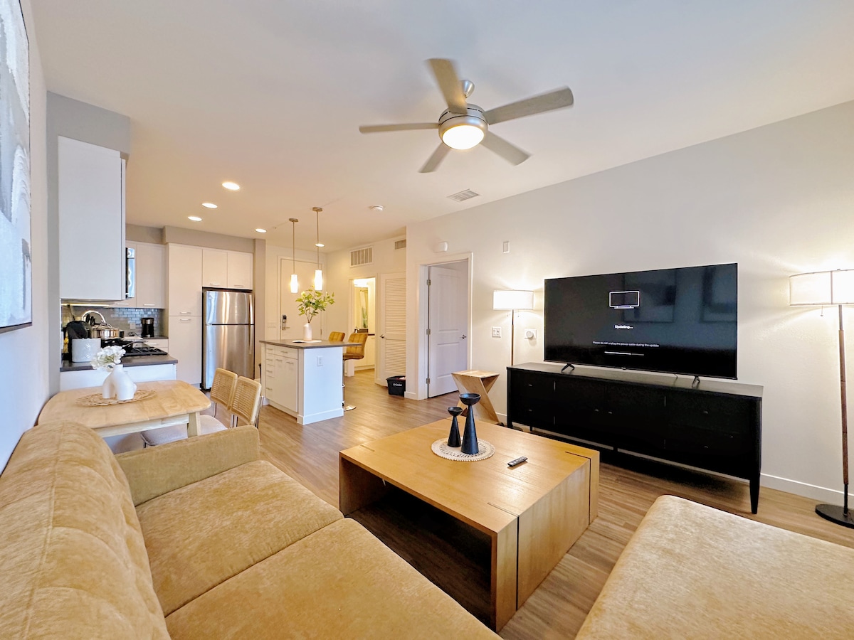 Nekas mazāks par IESPAIDĪGU, privātu, mierpilnu dzīvokli. KARALISKĀ gulta. Ērti guļ 2. Gulēšana dīvānā nav obligāta. Pilna duša/vanna. Aptuveni 725 kvadrātpēdas. 65collu viedtelevīzija viesistabā. Veļas mazgājamā mašīna/žāvētājs (mazgāšanas līdzeklis). Pilnībā aprīkota virtuve ar visu nepieciešamo īsai vai ilgai uzturēšanās reizei. Ledusskapis ar ledus automātu. ĀTRS Wi-Fi. Kopīgs baseins, burbuļvanna un sporta zāle. Pilnībā sanitāri apstrādāts un tīrs. Viena piešķirta autostāvvieta. Lūdzu, nāciet mierā vai neienāciet vispār. Izbaudiet