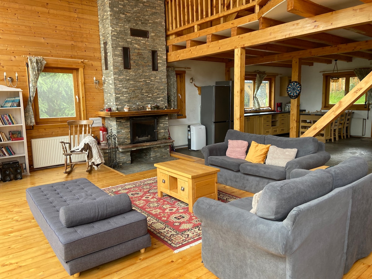 Carpathian Log Home, stunning glass wall chalet