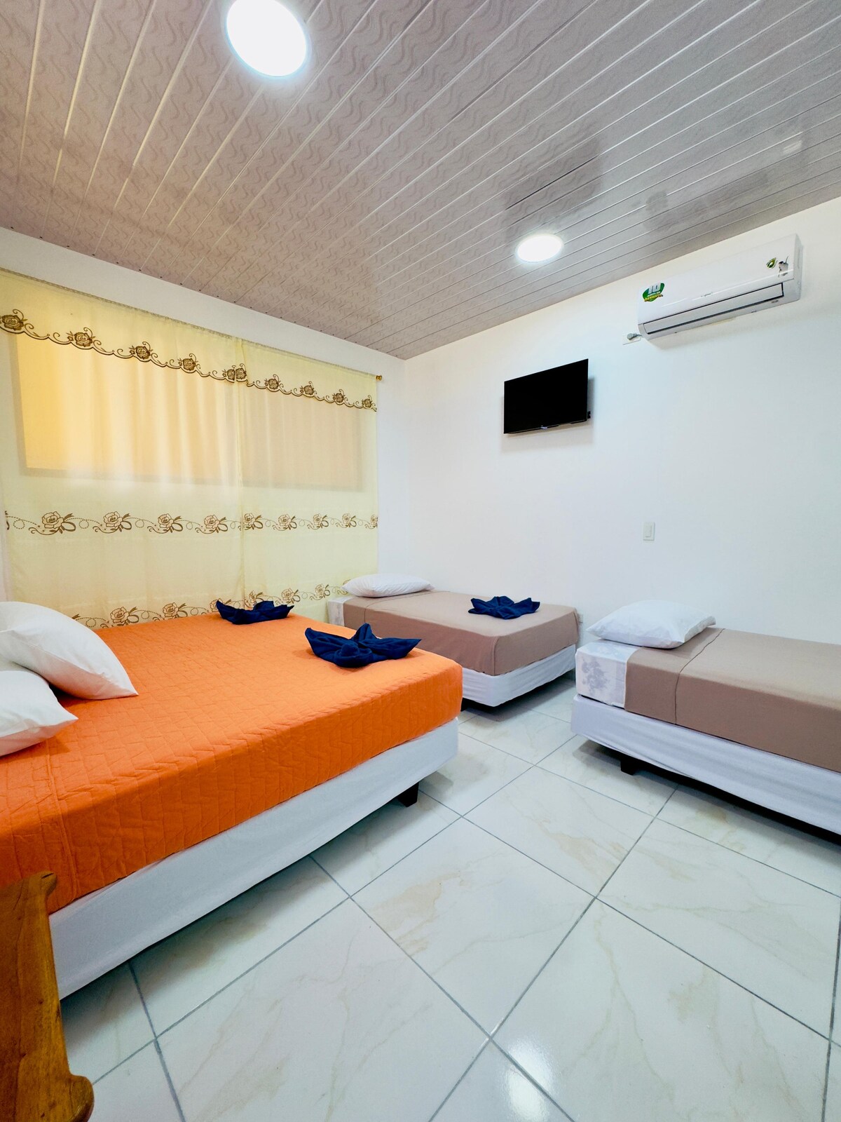 Habitación doble cómoda y funcional ubicada dentro de un hotel en Galápagos, ideal para parejas o dos viajeros que buscan descanso después de un día de playa y recorridos por la isla. El hotel cuenta con piscina, patio y mesas al aire libre para disfrutar un ambiente tranquilo. Se encuentra a pocas cuadras del mar, lo que permite llegar caminando a la playa. Espacio limpio, bien cuidado y con excelente relación precio–calidad.